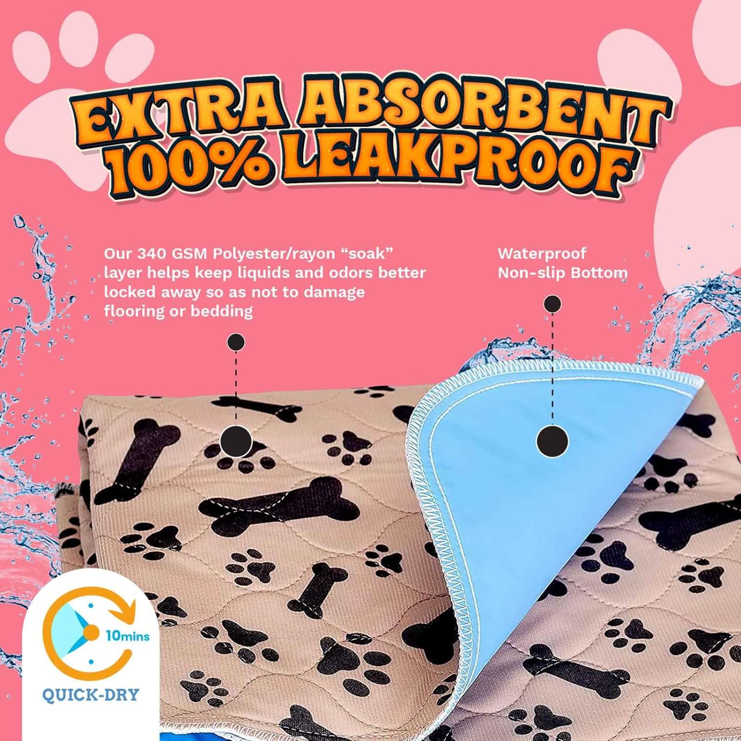 - Absorción superior: ofrece casi el doble de absorción que nuestros competidores, nuestra capa de poliéster y rayón de 340 GSM ayuda a mantener los líquidos y olores mejor bloqueados para no dañar el suelo o la ropa de cama