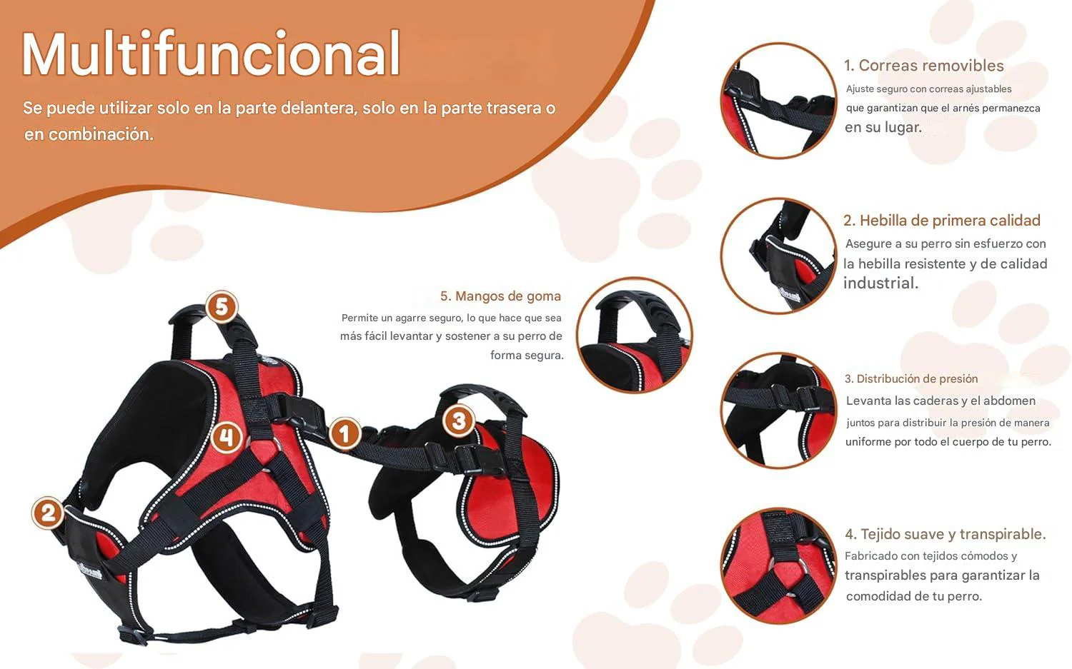 • Beneficios: Este arnés multifuncional levanta las caderas y el abdomen juntos para distribuir más uniformemente la presión sobre el cuerpo de tu perro. Simplemente levántalo de las asas de goma.
