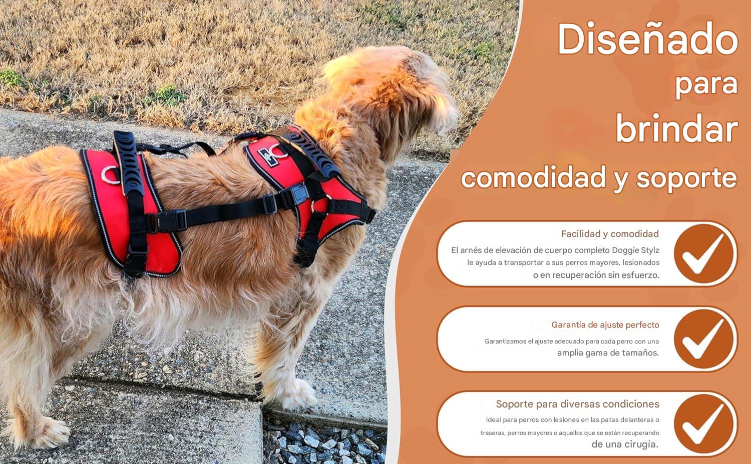 • Descripción general: El arnés delantero se puede utilizar solo como arnés diario. La sección trasera se puede utilizar de forma independiente o en combinación para una máxima asistencia de elevación. Levanta a tu perro con facilidad con el arnés Doggie Stylz de levantamiento de cuerpo completo.