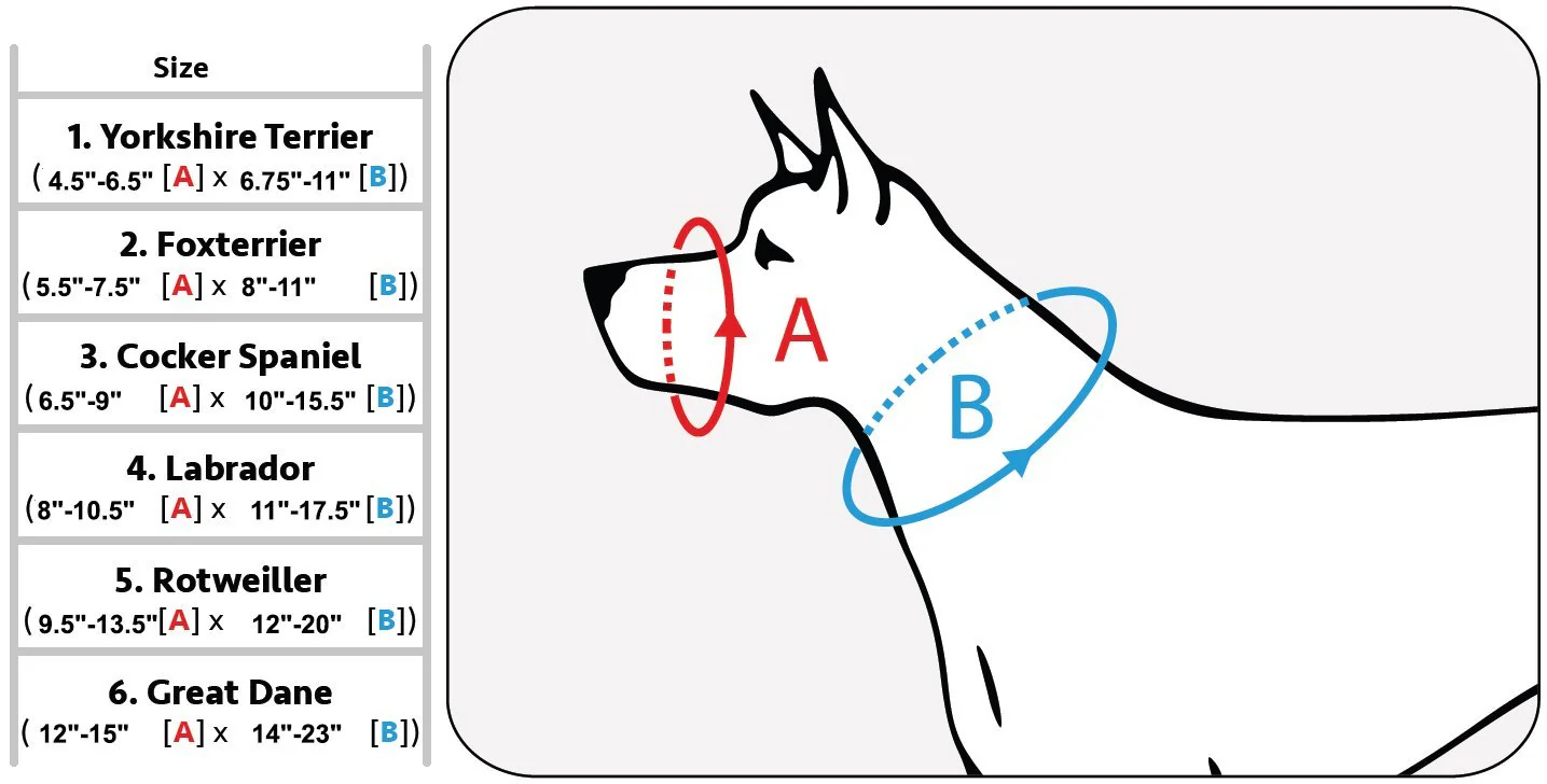 - Bien ajustado, cómodo, fácilmente ajustable. Disponible en 6 tamaños. Utilice la imagen del gráfico para referencia de tamaño. El tamaño pequeño se puede ajustar para adaptarse a la circunferencia del hocico de 5.5 «-7.5».
