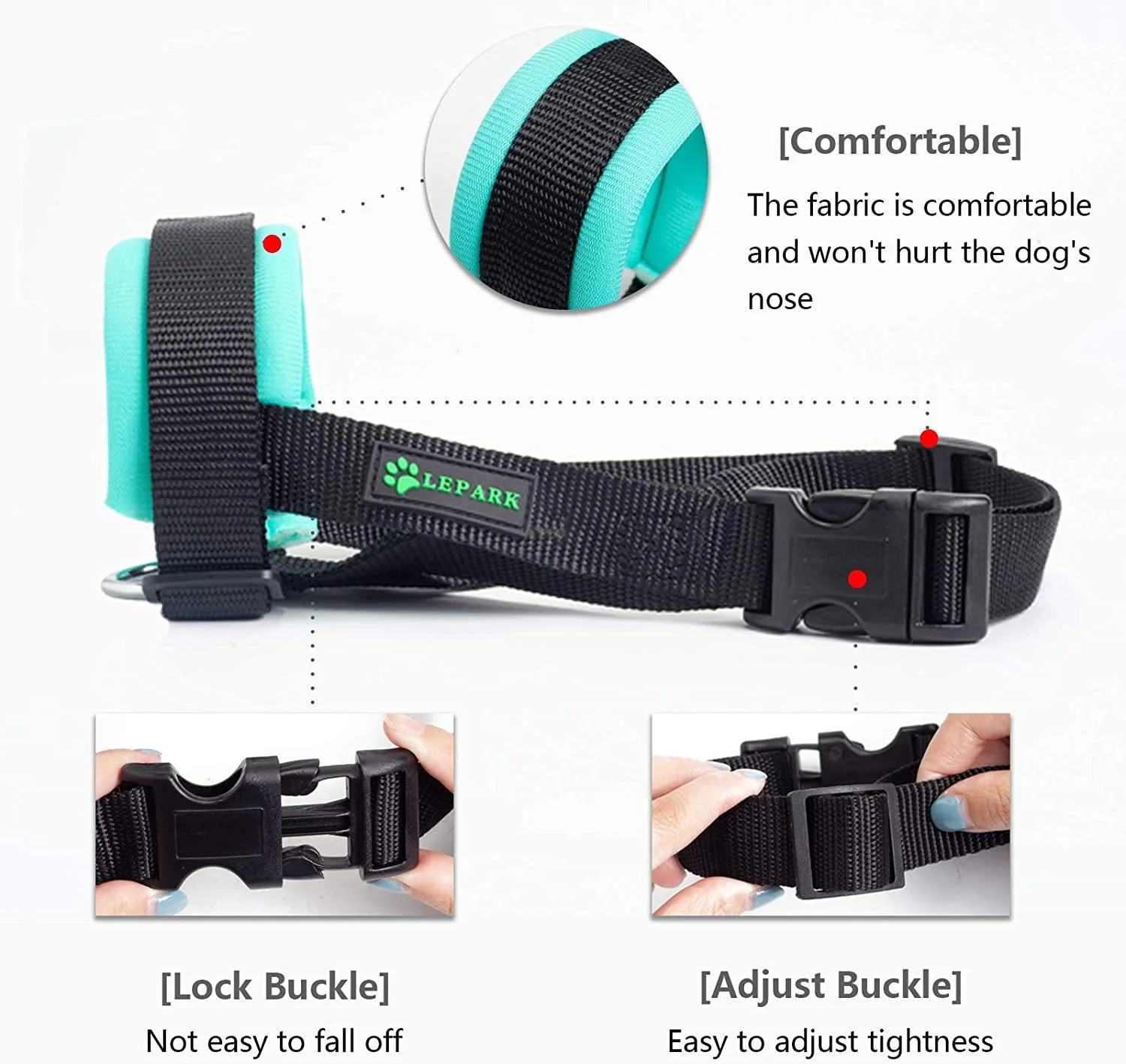 - Cómodo: este bozal para perro está acolchado con material de tela suave, lo que hace que los perros se sientan cómodos y transpirables.
