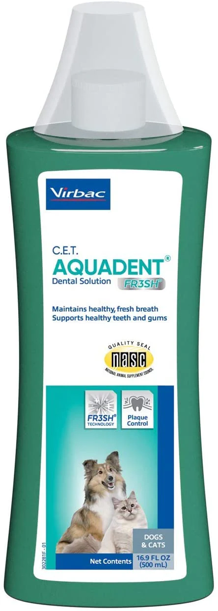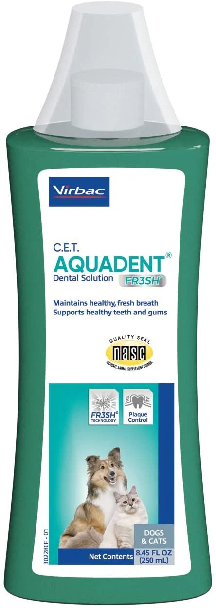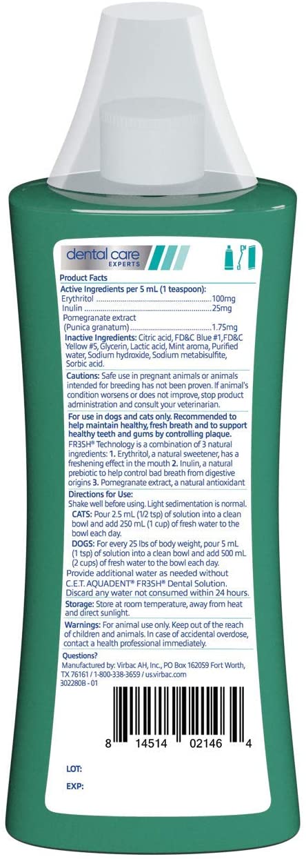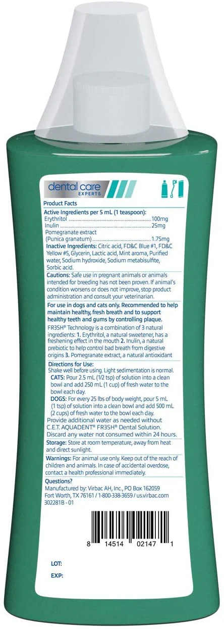 Una solución saludable para un aliento fresco y mucho más. La nueva formulación para C.E.T. La solución dental AQUADENT FR3SH ayuda a mantener el aliento fresco y apoya dientes y encías saludables controlando la placa en perros y gatos. Está desarrollado para tu mascota con la tecnología FR3SH, una combinación de tres ingredientes naturales: eritritol, granada e inulina.