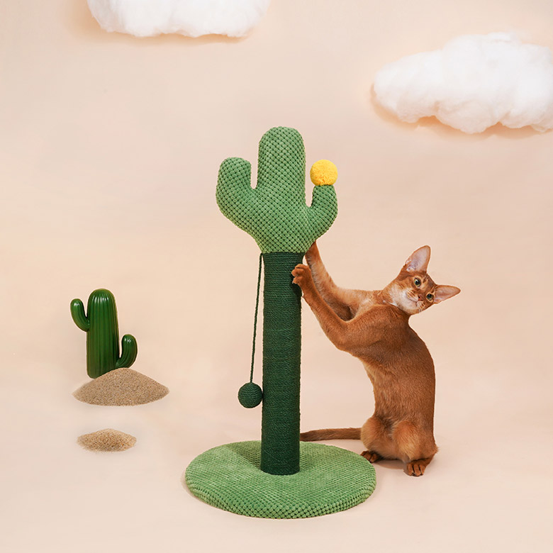 The cat stretched and yawned in a sunlit spot by the window. It had woken from its nap eager to play. Across the room stood its favorite toy: a green cactus scratching post.The cat trotted over and rubbed its cheek against the post’s soft covering. A dangling ball swayed, catching its eye. As it pounced and batted the toy, upbeat sounds filled the air.Rearing up on back paws, the cat raked its front claws through woven ropes that were rough enough to satisfy its itch but not hurt delicate pads. With a solid base holding firm, the post made the perfect companion on sunny afternoons.Watching from the kitchen, Cats’ owner smiled at her playful antics. They were glad she took such pleasure from her cactus cat scratcher on sunny living room afternoons like this.