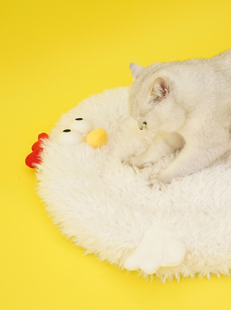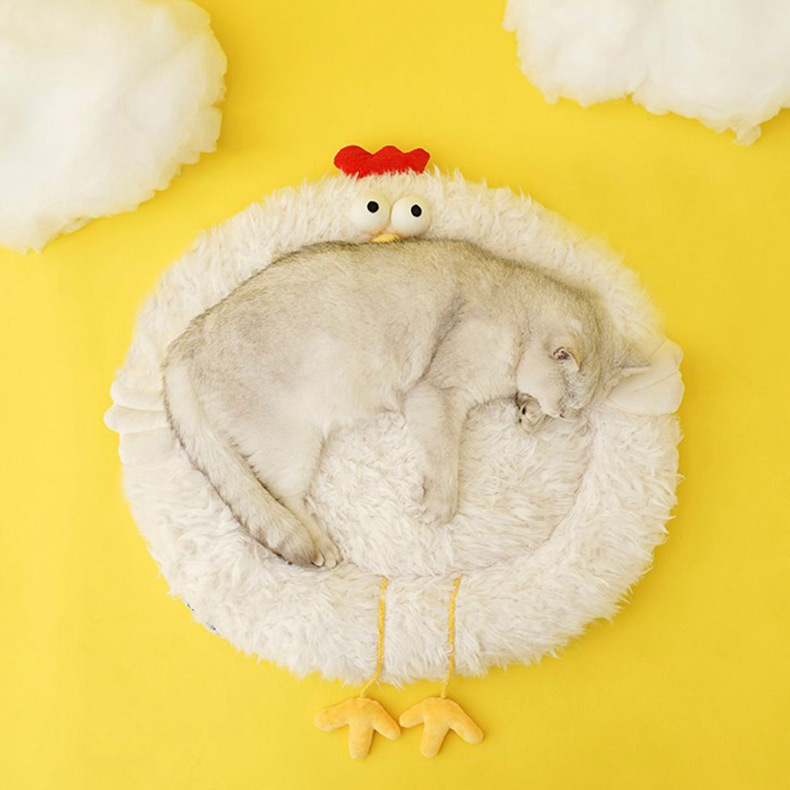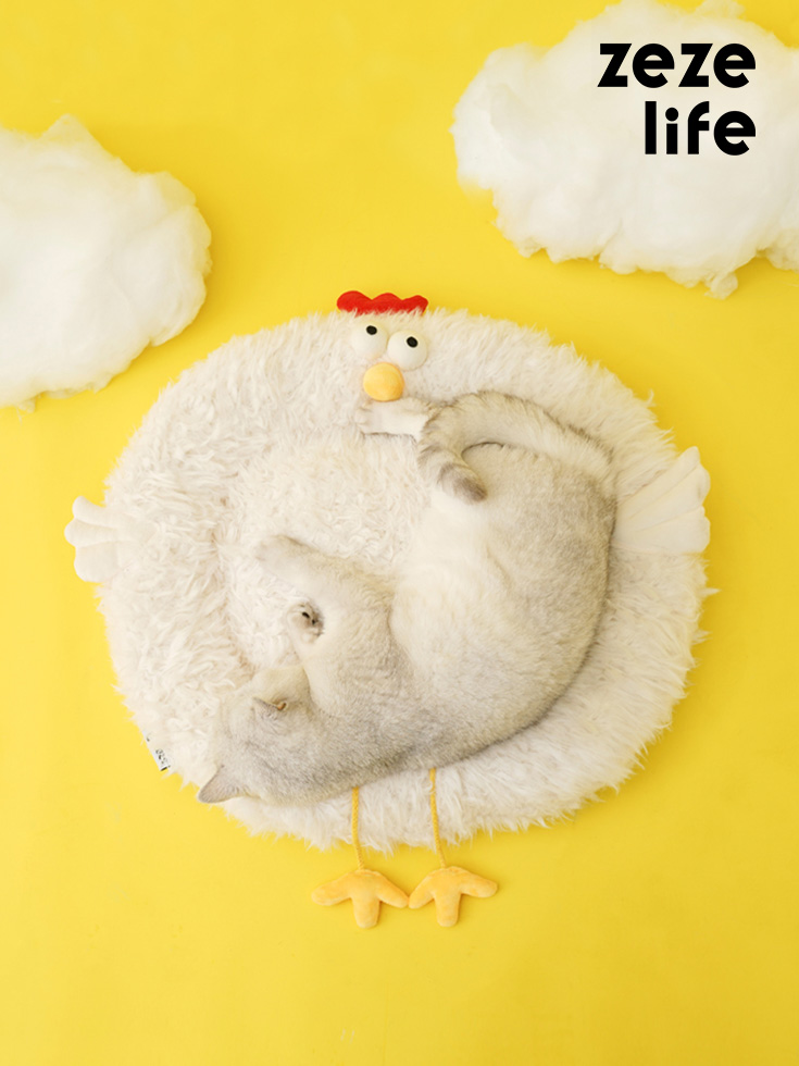 Kitten easily fell into a deep sleep in the arms of the chick cluck bed mat, feeling the warmth in the cold winter while cute chick feet hanging around.
