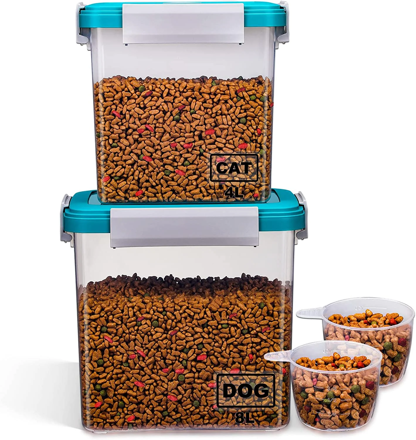 - Contenedor hermético de almacenamiento de alimentos para mascotas: el recipiente de comida para perros y gatos cuenta con un sello hermético con 4 hebillas de sellado, las costuras utilizan sellos de silicona. El buen diseño de sellado es a prueba de fugas, a prueba de humedad y polvo, lo que mantiene la comida para mascotas fresca y seca durante mucho tiempo.