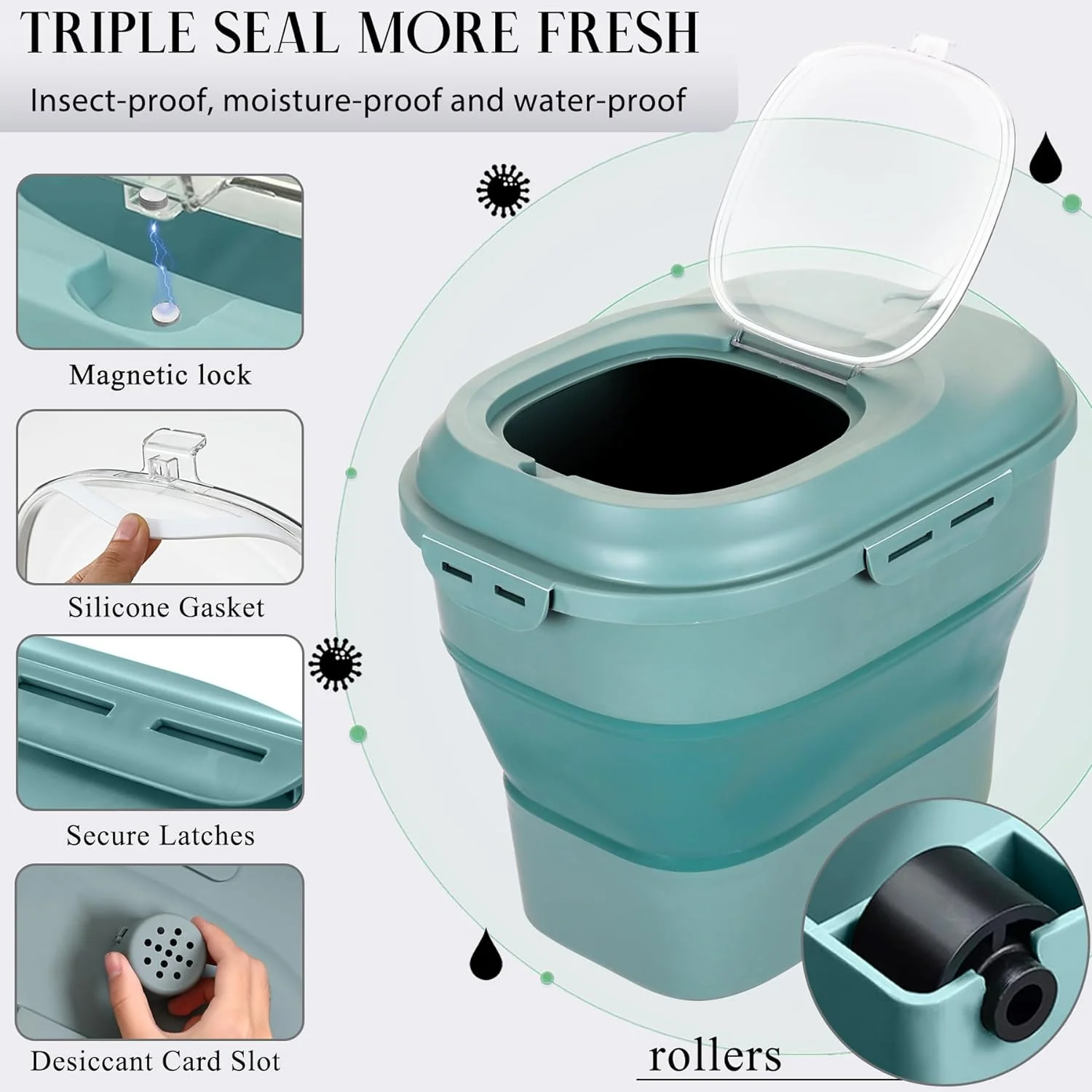 - Material de grado alimenticio: El contenedor de almacenamiento de alimentos para mascotas está hecho de plástico de polietileno de alta densidad sin bisfenol A (BPA), que es resistente y duradero. La parte plegable central está hecha de material de caucho termoplástico (TPR), que es dúctil y se puede plegar repetidamente. Nota: El olor suave del plástico de polietileno es normal, no tóxico. Puedes almacenar de forma segura los alimentos de tu lindo miembro de la familia en nuestro recipiente sellable para alimentos de mascotas.