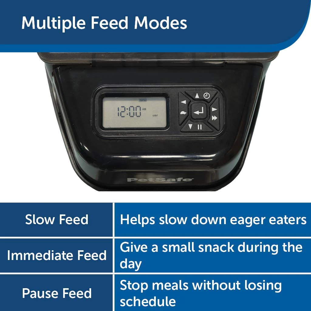 - Personaliza las comidas de tu mascota programando el comedero para dispensar 1/8 taza a 4 tazas hasta 12 veces al día. La tolva tiene capacidad para hasta 24 tazas de alimentos secos o semi húmedos.
