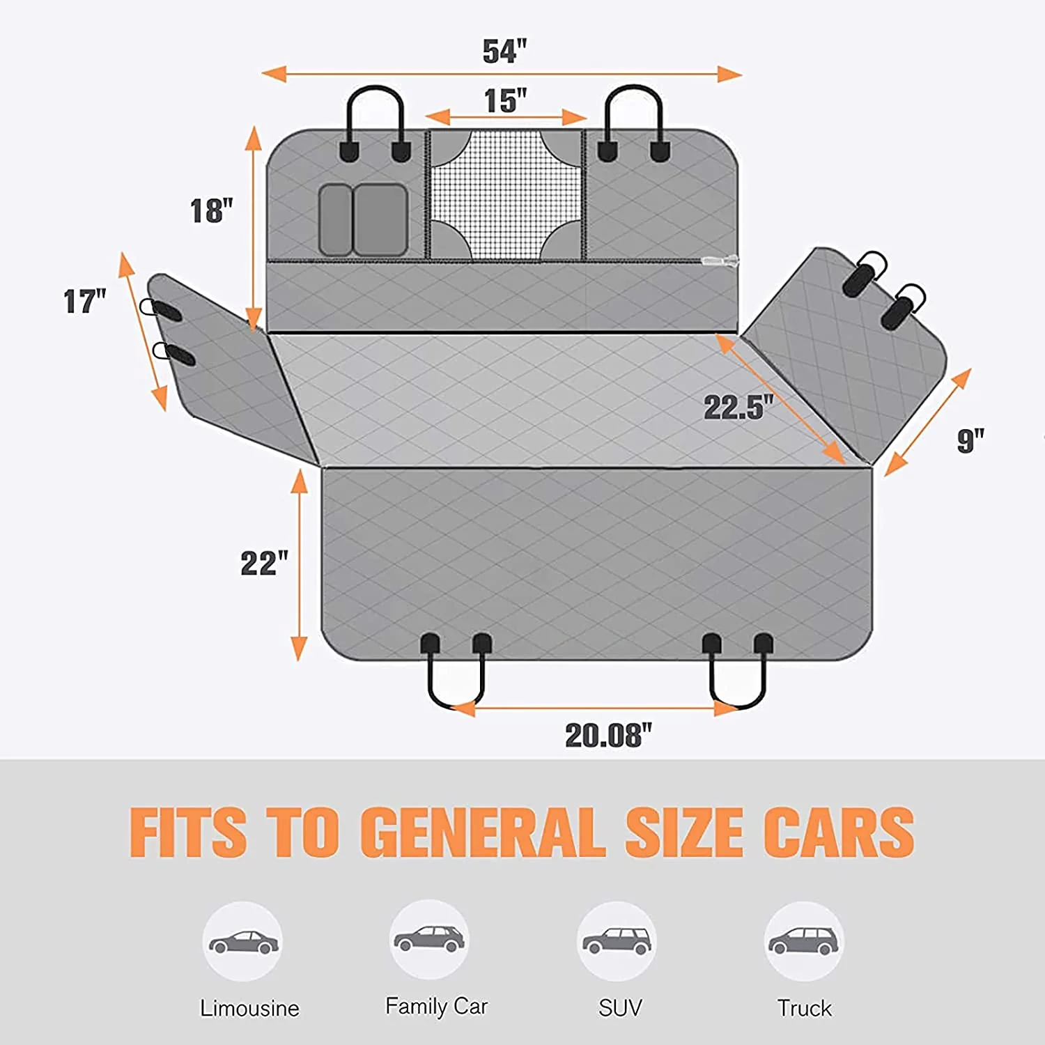Ajuste perfecto: tamaño perfecto de 53.9 in de ancho x 57.9 in de largo, se adapta a diferentes vehículos como coches, camiones, SUV. Proporciona a tus mascotas comodidad mientras mantienes el interior de tu vehículo a salvo de arañazos, pelaje y orina (100% impermeable). También es perfecto para proteger de daños causados por los asientos de coche de bebé. Y para los niños, puede proteger el asiento trasero de derrames de alimentos y jugo.