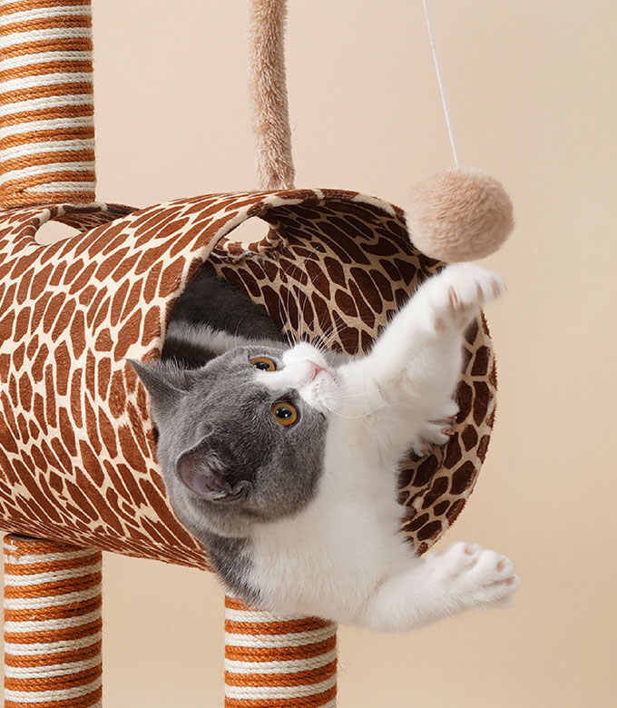 - High Density Base Plate – Choose a thickened bottom plate to ensure that the giraffe cat tree with tunnel will not shake or collapse when the cat is play. At the same time, the four corners of the bottom plate are also designed with curved wrapping, making it safer for cats to play.