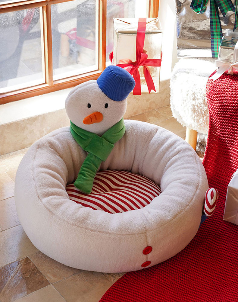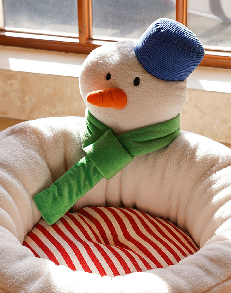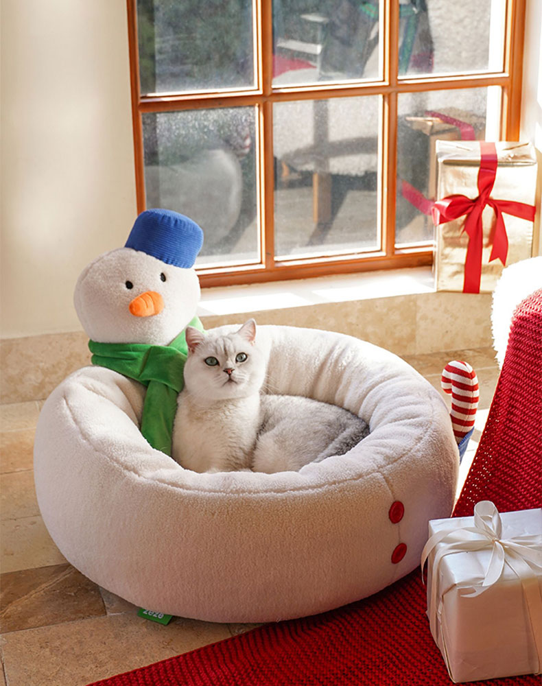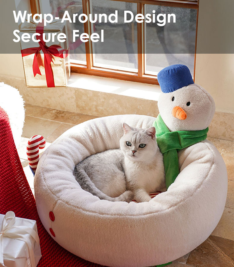 Misty sniffed at the colorful new bed by the tree, intrigued by its snowy shape. She pounced inside, settling into the plush wrap-around fabric. Misty pawed at the scarves, grinning as they swung back and forth. Snowflakes danced outside the window as she played. Soon tired, she crawled under a scarf and curled into a ball. Safe in her cozy winter den, Misty purred as snowmen and candies danced in her dreams through the night. When she woke, Misty remained cradled and warm. She had found the perfect bed to spice up her days with colors and games galore through the festive season.