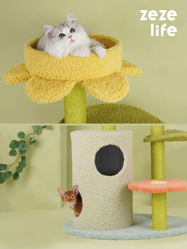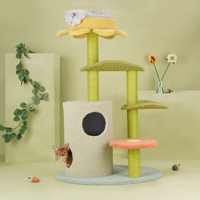 Beans was a furry, fearless explorer. She climbed up the yellow flower perch through the sturdy sisal post, and her claws made a scritch-scratch post sound. While at the top, she surveyed her entire territory. Below, sunlight passed through the window, casting a silhouette through the floor. A tall, cozy cubby hole was lying on the lowest platform, where she plotted her ambushes and domination. And with a triumphant meow, she’d sprawl out on the soft cushion like a real (purring) queen.