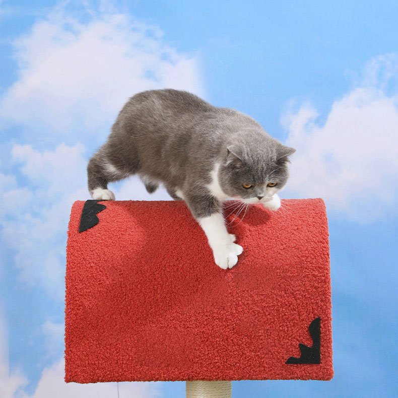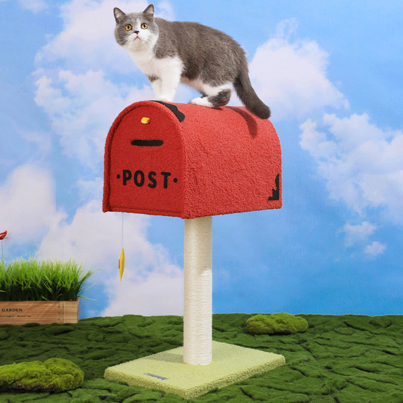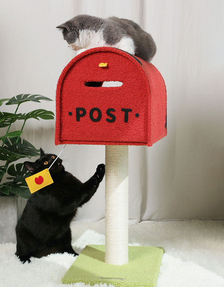 - Mailbox Post Cat Bed – The top platform is a red mailbox cat bed, where your cat can sleep or perch inside or on top of the box.
