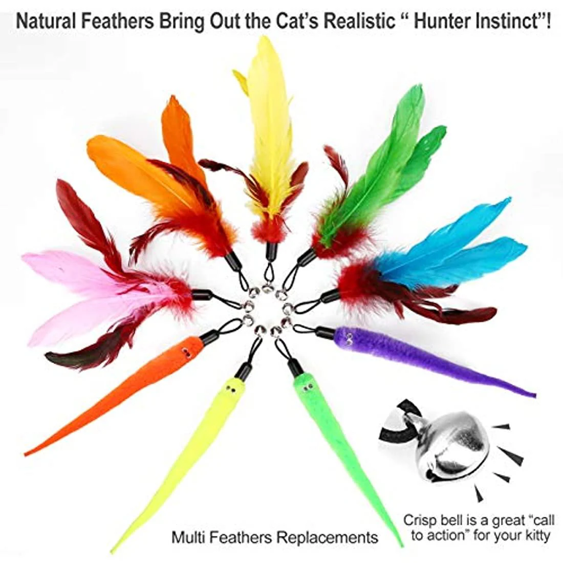5. Paquete económico: añadimos 2 varitas y 9 recambios de plumas en el paquete para asegurarnos de que estos juguetes para gatos se puedan utilizar durante largos períodos de tiempo. Los recambios de plumas y gusanos tienen más opciones de juego y más diversión.