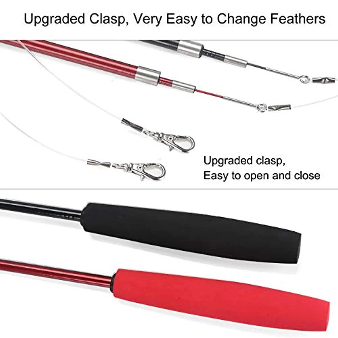 Este juguete de pluma de gato actualizado es una opción perfecta para gatos que persiguen el juego. El teaser voló como un pájaro y activó el instinto natural de un gato para perseguir y saltar, alentando a hacer una actividad saludable simultáneamente manteniendolos entretenidos. Y con la ligera y la varita de 38.9 pulgadas lo suficientemente larga, además de una cuerda de 23.6 pulgadas lo suficientemente larga, burlarse de tu gato ya no es un trabajo manual para ti.