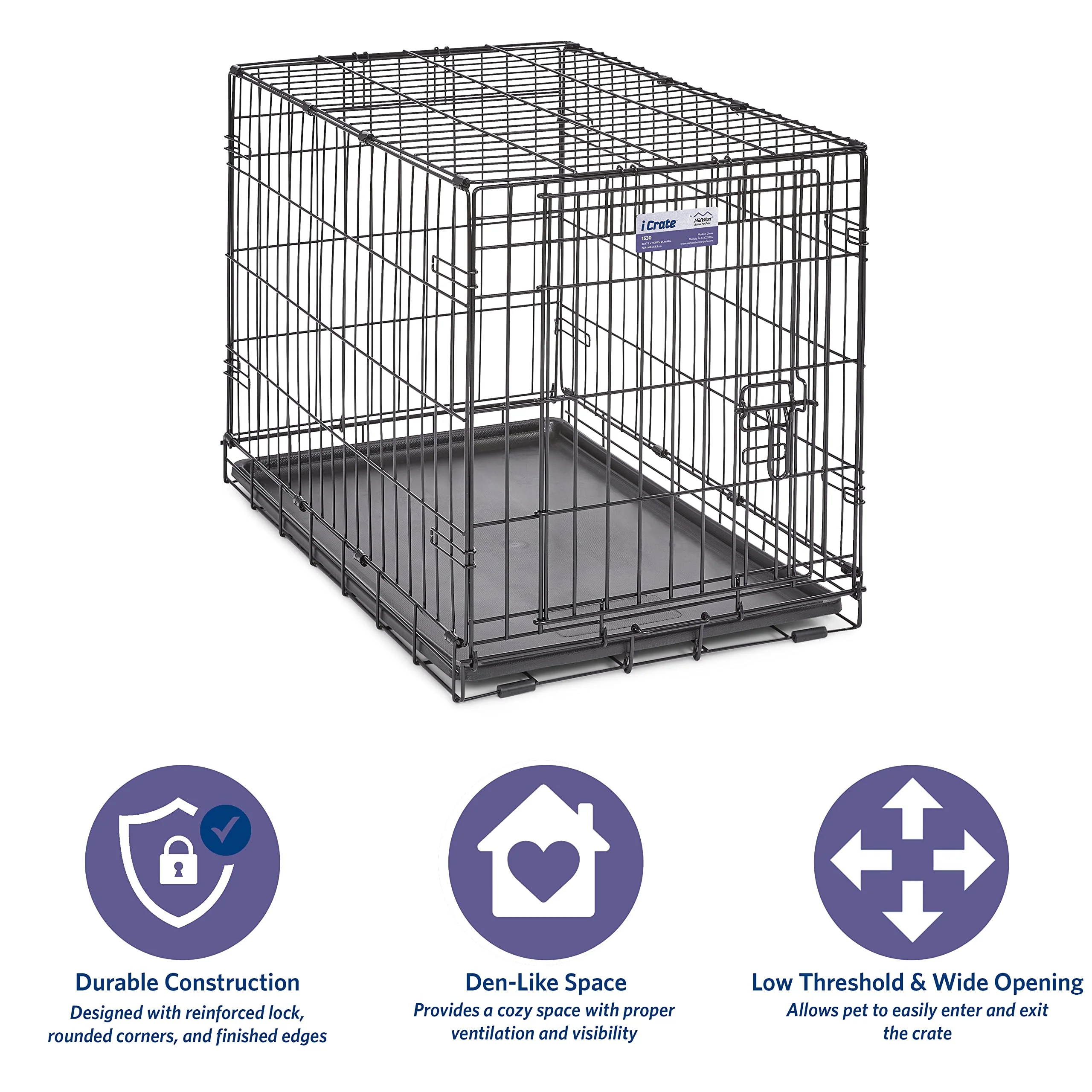- La jaula para perros iCrate de una sola puerta mide 30 x 19 x 21 pulgadas y es adecuada para razas de perros medianas con un peso adulto de 25 a 40 libras. Si el peso o las medidas de tu perro están cerca del máximo permitido para esta jaula, te recomendamos comprar el siguiente tamaño de jaula.
