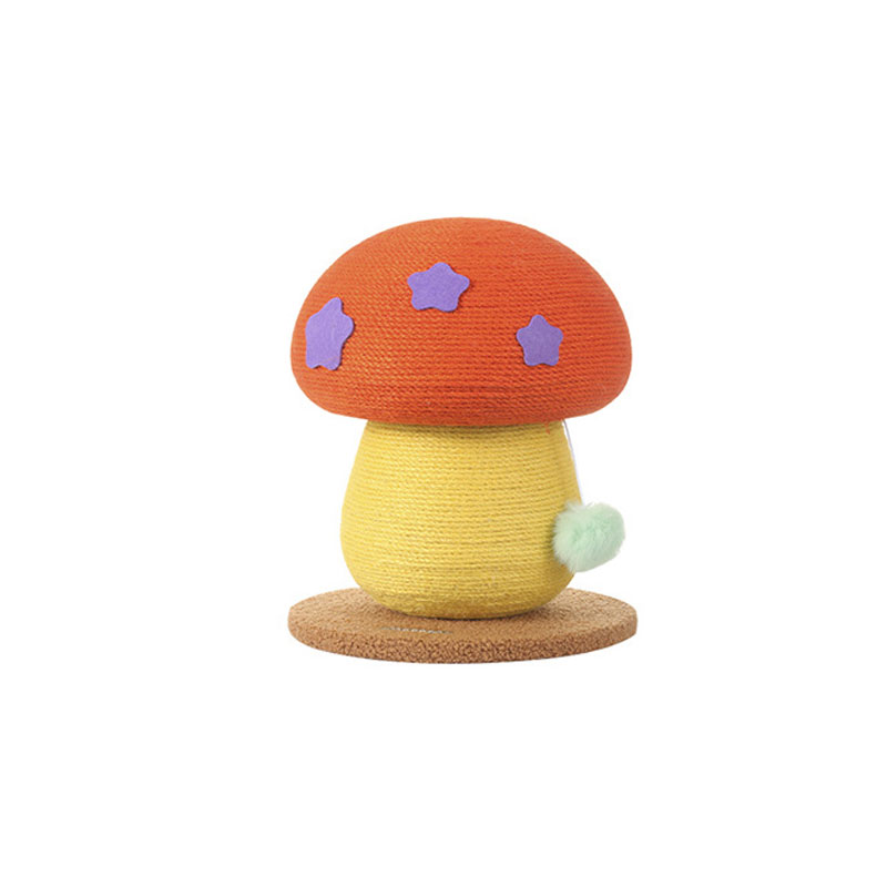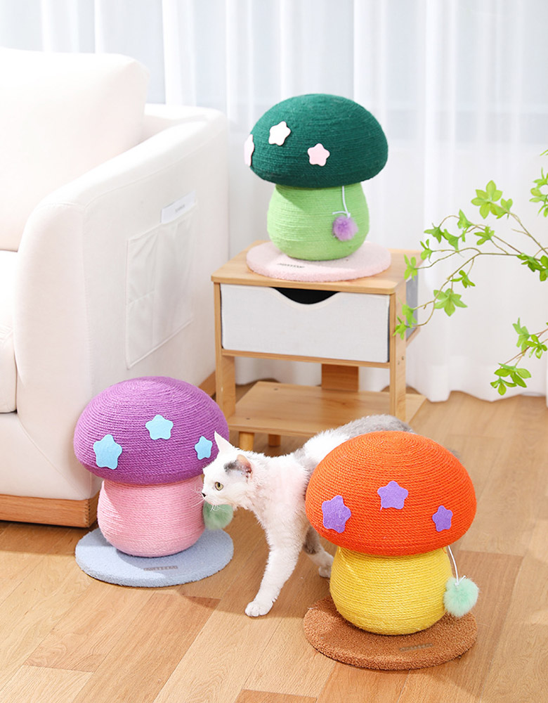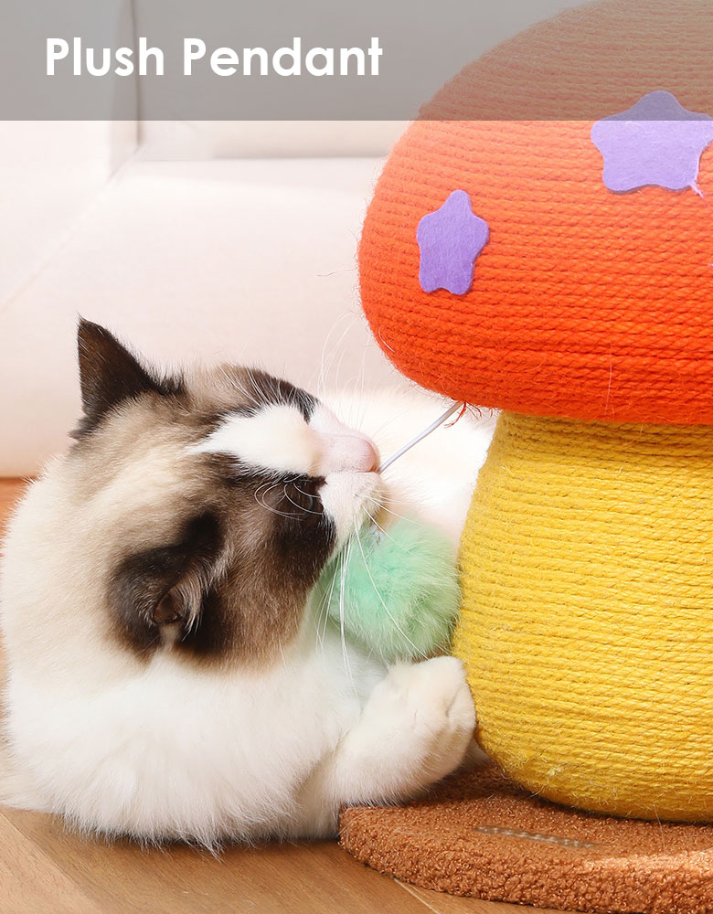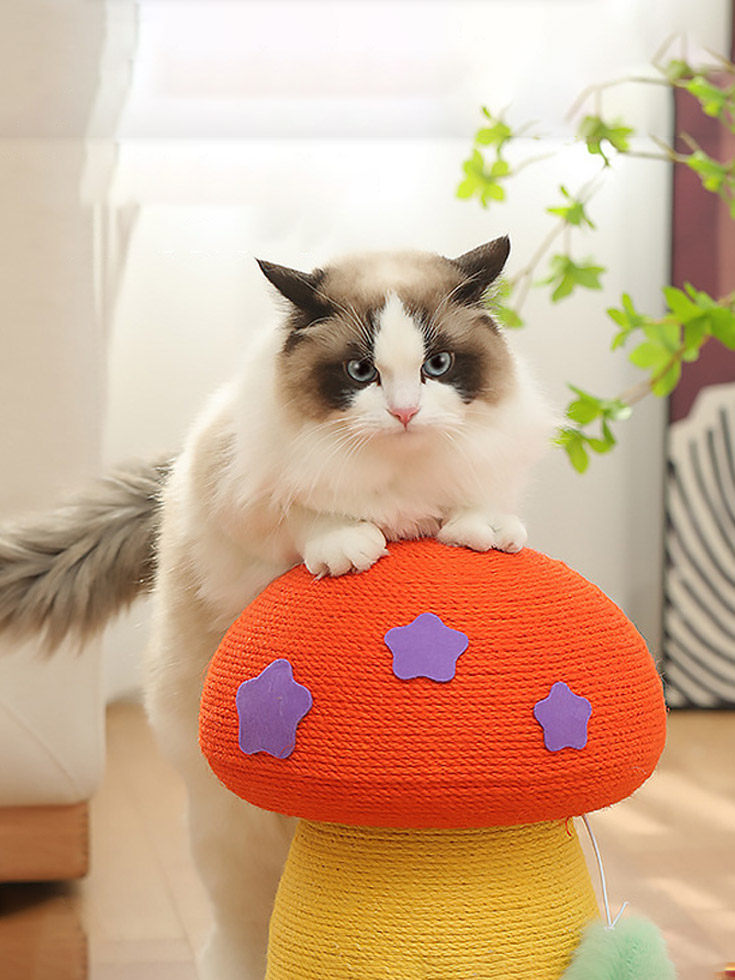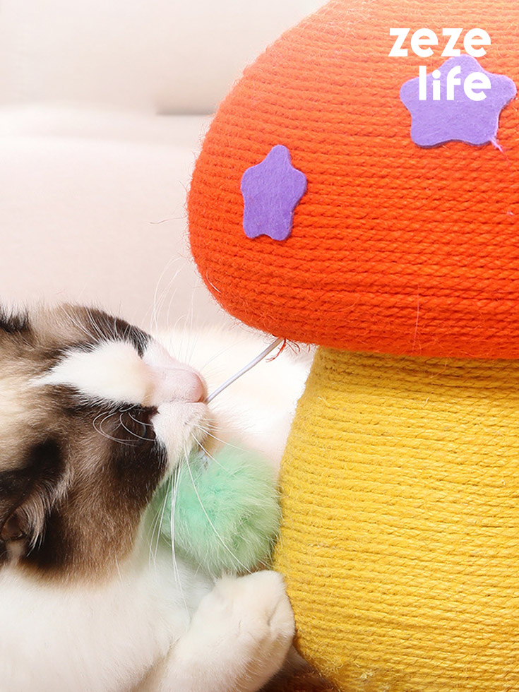 The morning sun shone through the window, its warmth rousing the curious cat from her nap. That’s when she spotted it – a large red mushroom had appeared across room. Intrigued, she padded over to investigate. The soft fleece felt nice under her paws and she sunk her claws into the dense sisal ropes, eliciting a deep purr. Kneading and scratching with delight, she loved how this toy engaged her senses. As she played, the sturdy wooden base kept the mushroom steady. She climbed atop the cap, enjoying the view, before pouncing on the plush pendant below. Renewed energy surged through her little body. Basking in the calm atmosphere, the cat was thankful for her cozy home and the special mushroom cat scratcher that stoked her instincts so joyfully on this sunny day.