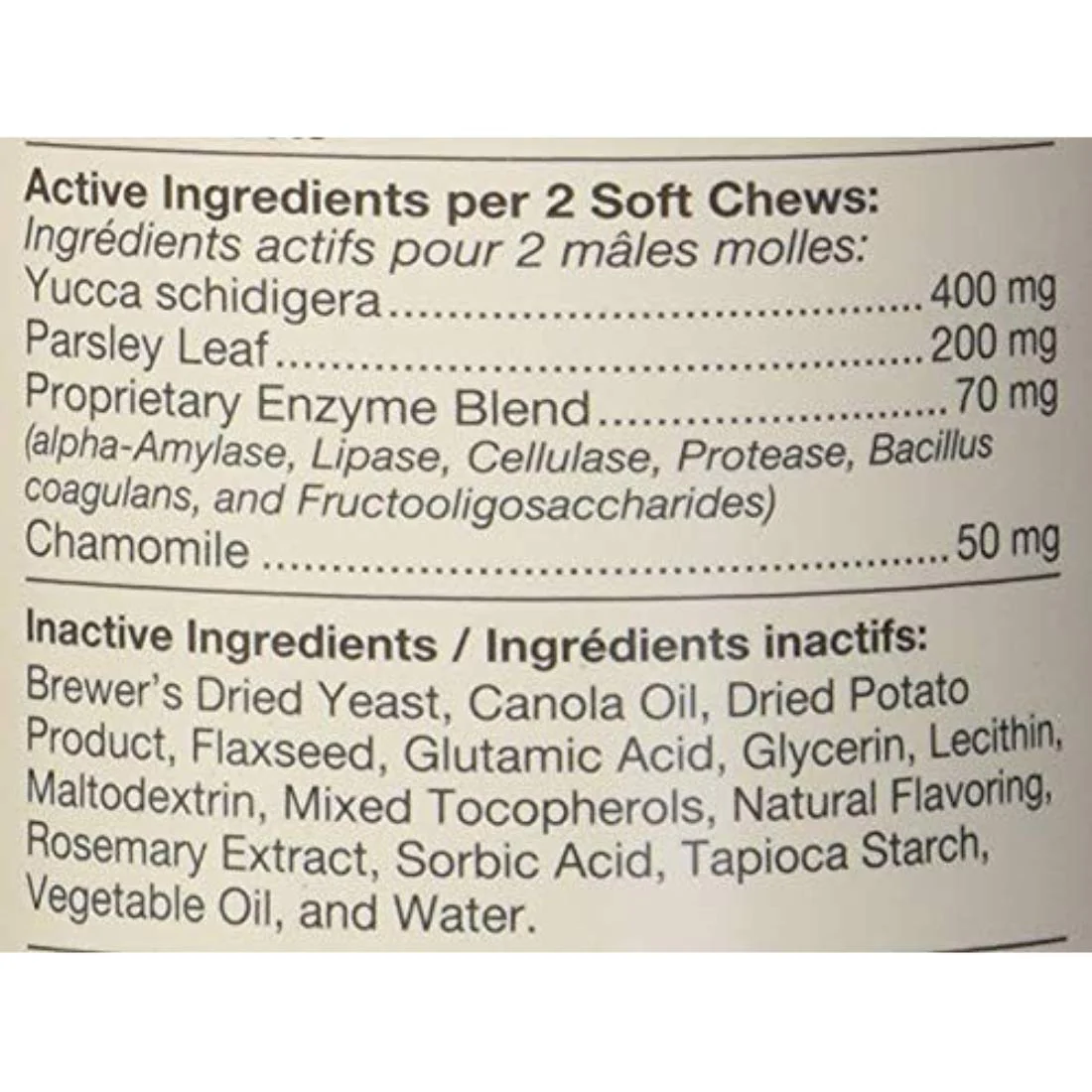 * Nuestra combinación de fórmula especial de yuca, perejil, manzanilla y enzimas patentadas ayuda a los perros a consumir sus propias heces o las heces de otros perros, si también se alimentan con NaturVet Coprophagia.
