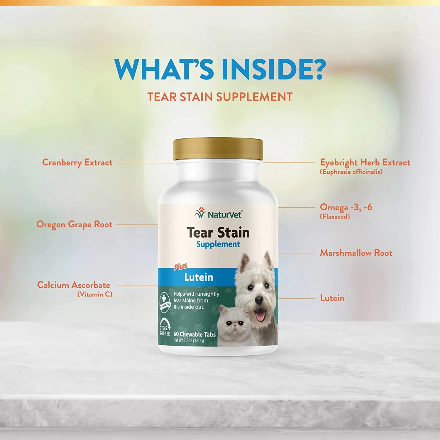 - Apoyo inmunológico: suplemento de apoyo inmunológico que lubrica las membranas mucosas para ayudar a eliminar y reducir las manchas de desgarro de tu mascota.