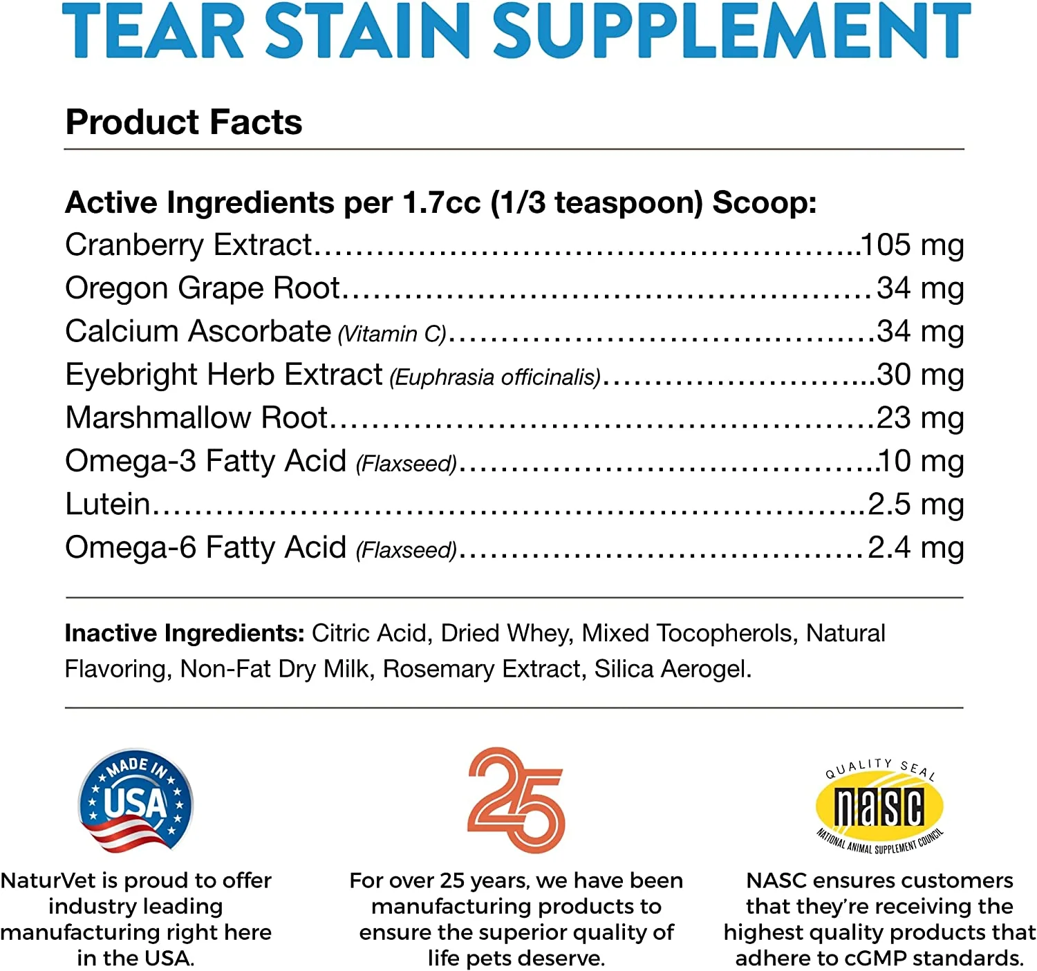 - Fabricado en los Estados Unidos y formulado por veterinarios: todos los productos NaturVet están formulados y fabricados por veterinarios en los Estados Unidos en una instalación auditada por la FDA, cumple con cGMP.