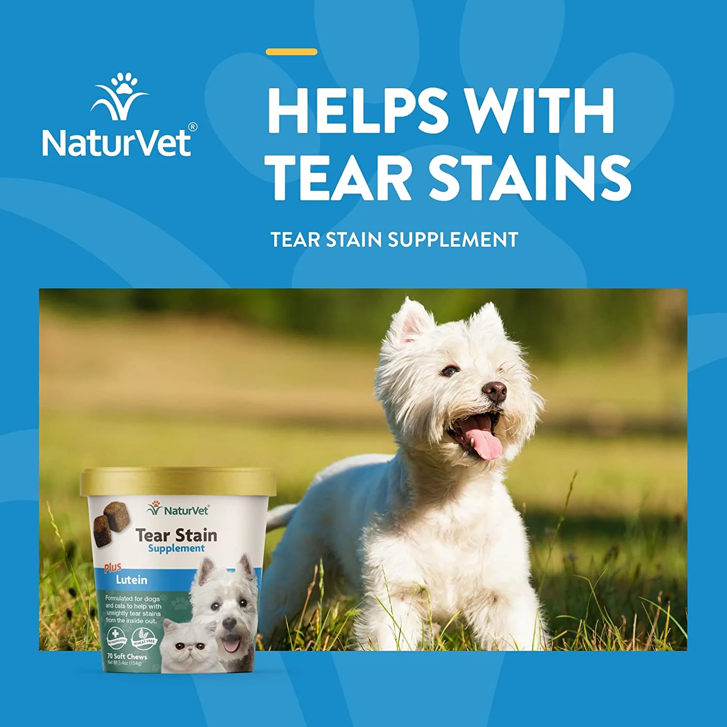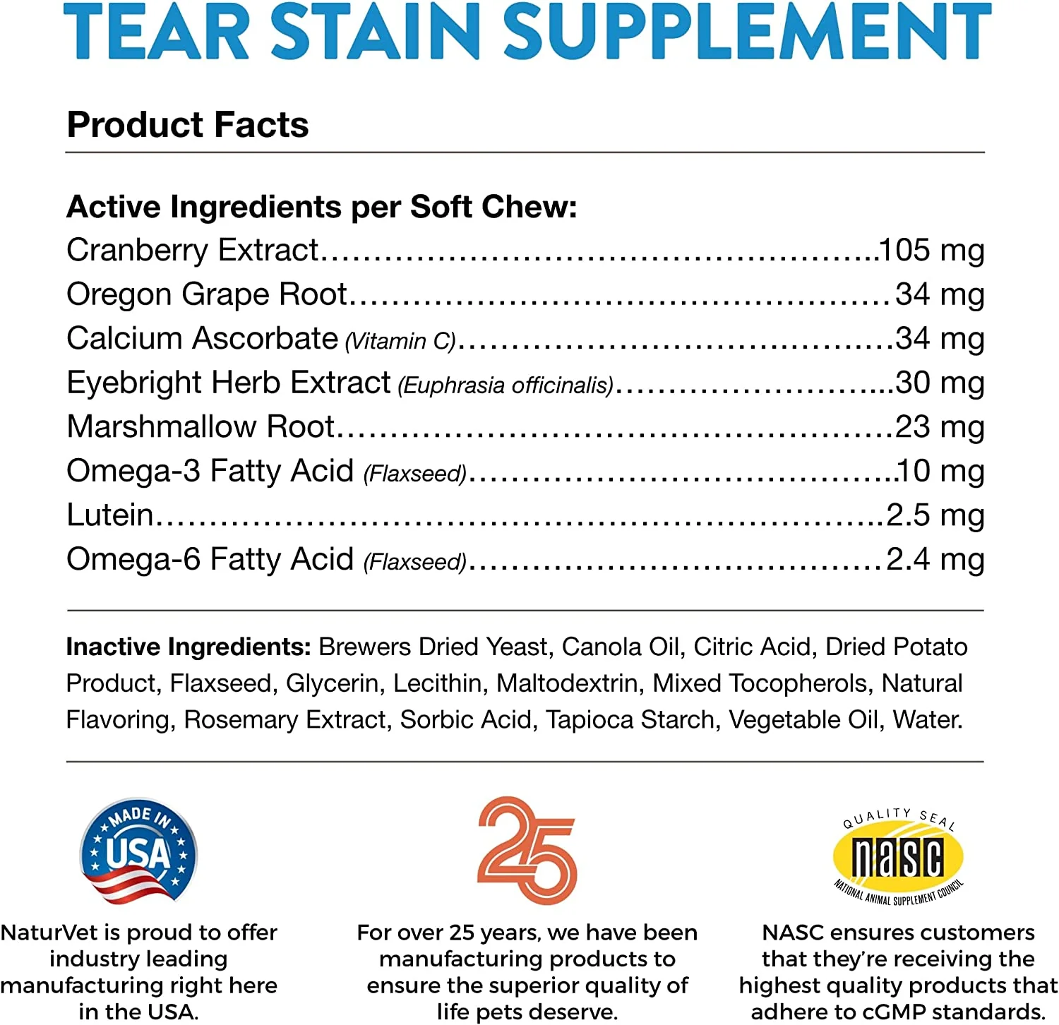 - Fácil de administrar: dale a diario hasta que las manchas de desgarro desaparezcan y luego continúa su uso durante 30 días adicionales. Después de 30 días, deja de administrar y úsalo solo cuando sea necesario.