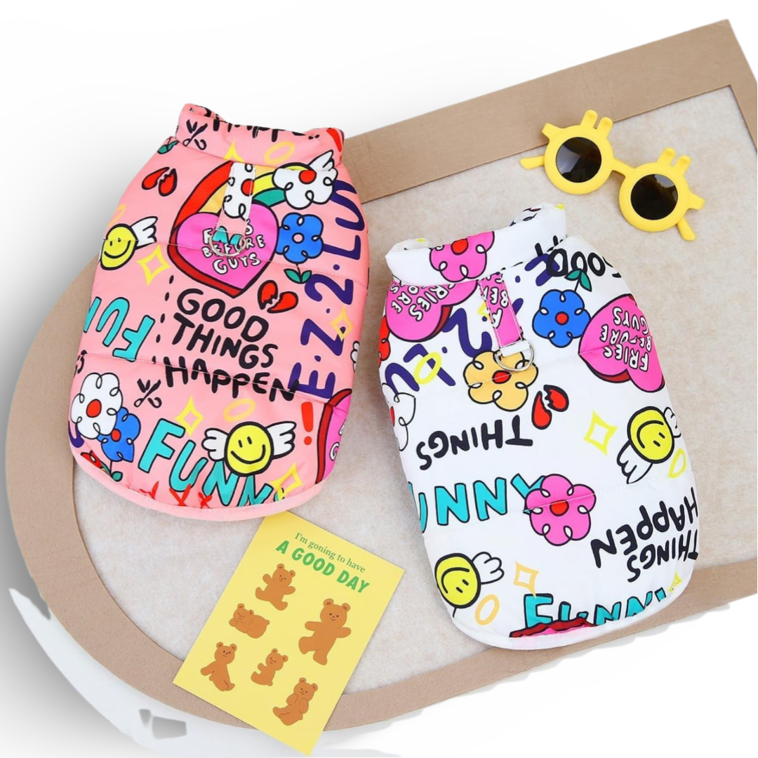 El chaleco tiene un diseño elegante y moderno con charms en forma de corazones, estrellas y flores. Estos charms le darán a tu perro un toque de estilo.