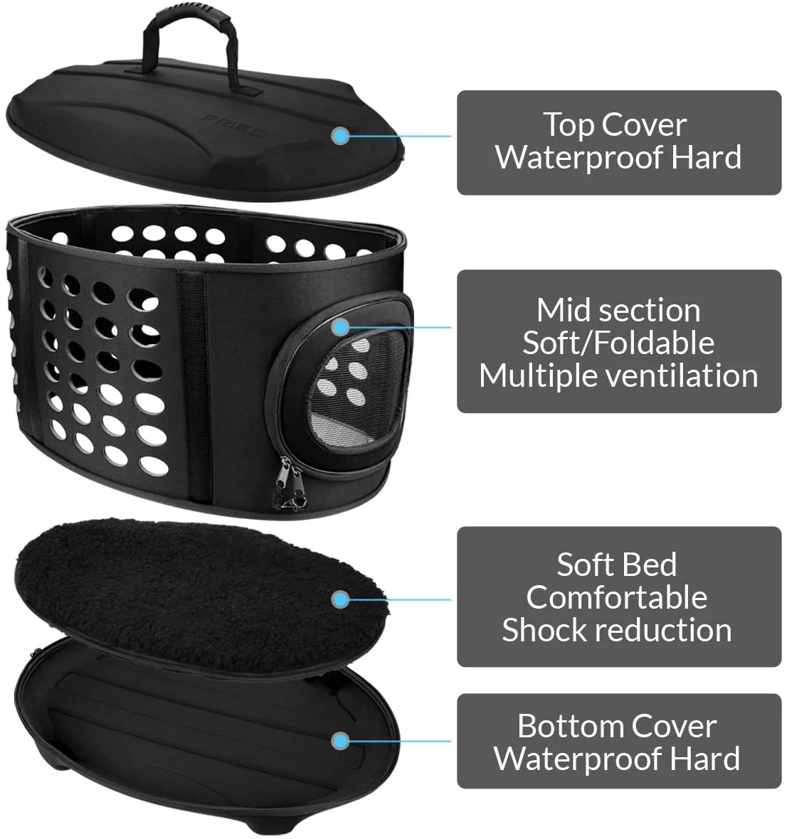Diseño plegable: gracias a su suave sección media, nuestros transportadores son completamente plegables para ahorrar espacio. Simplemente colapsa el soporte, cierra la parte superior e inferior y colócalo debajo de la cama. Acabado con una puerta transparente, las mascotas pueden ver el mundo exterior.