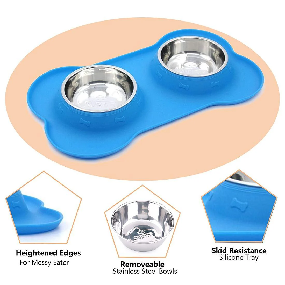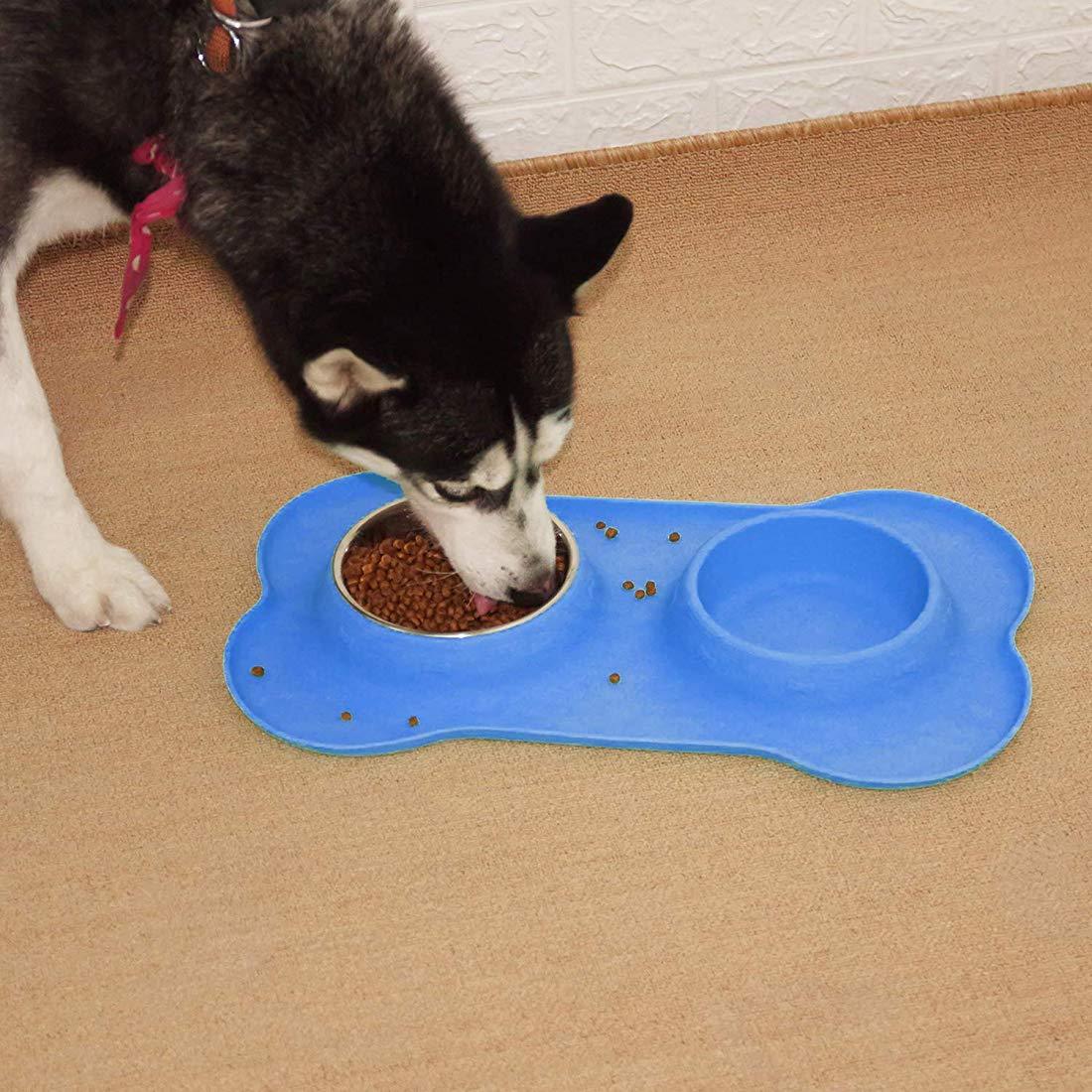 Nuestro tazón para mascotas con juego de colchonetas de alimentación puede ayudarte a deshacerte de esta terrible pesadilla. La estera de silicona evita que el tazón se resbale en el piso y el área extra grande con bordes elevados para contener los alimentos y los derrames de agua para mantener tu piso limpio. el recipiente de acero inoxidable y la esterilla de silicona son aptos para lavavajillas, muy fáciles de lavar o limpiar. ¡Le ahorrará mucho tiempo y energía!