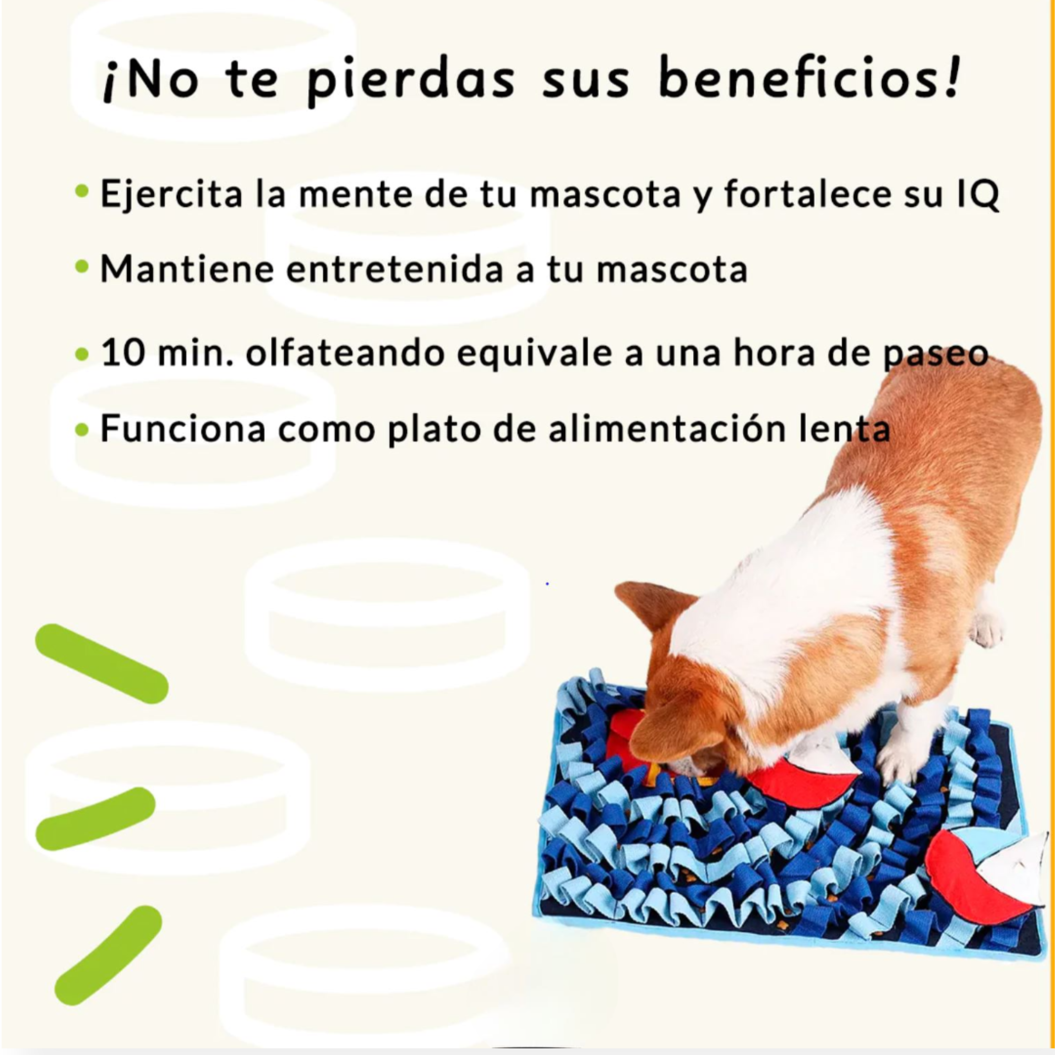 Juguetes para perro o tazón de comida: el tapete puede ser utilizado como juguete para perro de búsqueda, esconde entre sus tiras los premios favoritos de tu mascota; además puede ser utilizado como plato de alimentación lenta, esconde la comida de tu perro y permite que busque con ayuda de sus patas y nariz.