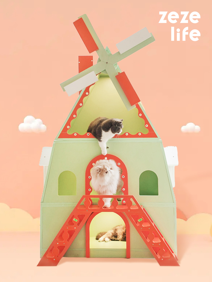 In the afternoon, Breeze dozed in the sun-warmed lookout, contentedly gazing outside. When her friend Gust arrived, they chased each other through spinning levels. Best of all, placed beside cozy bookshelves, this wind-powered manor brought endless joy to the playful felines in their domain, a whimsical addition to any room.