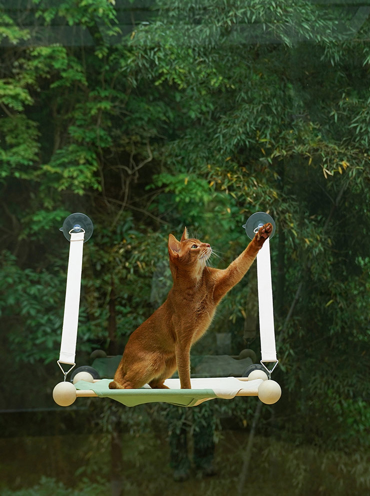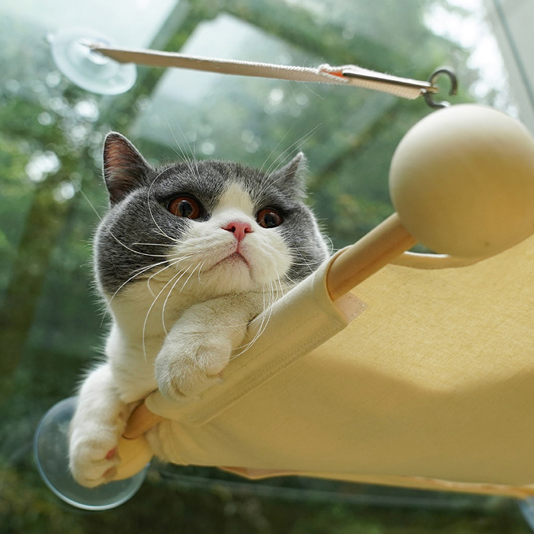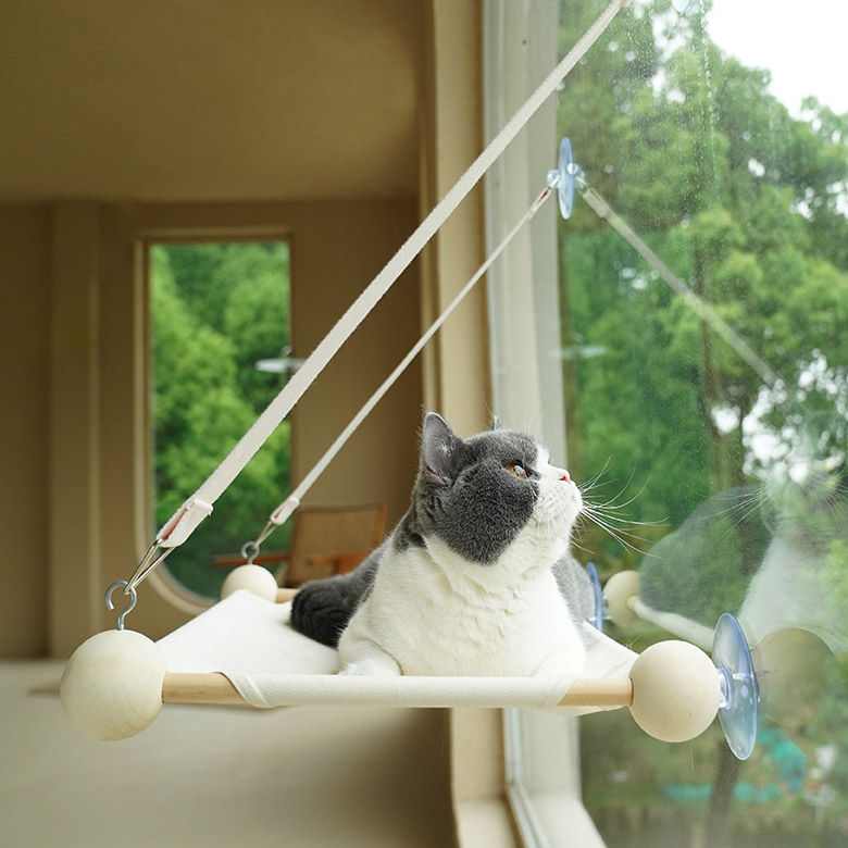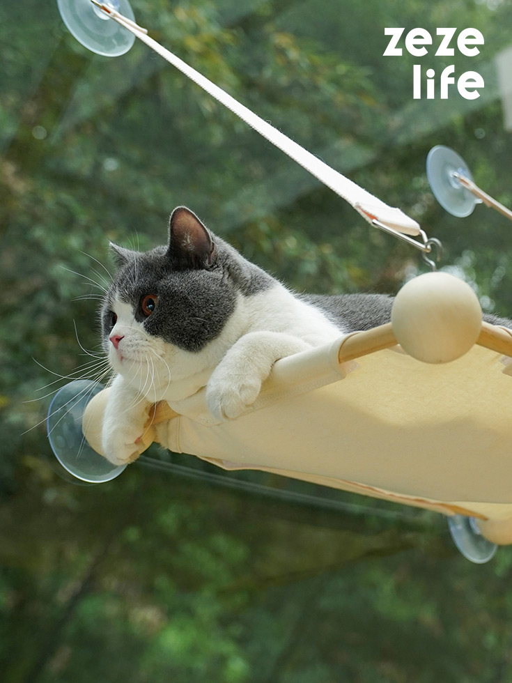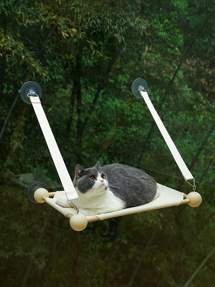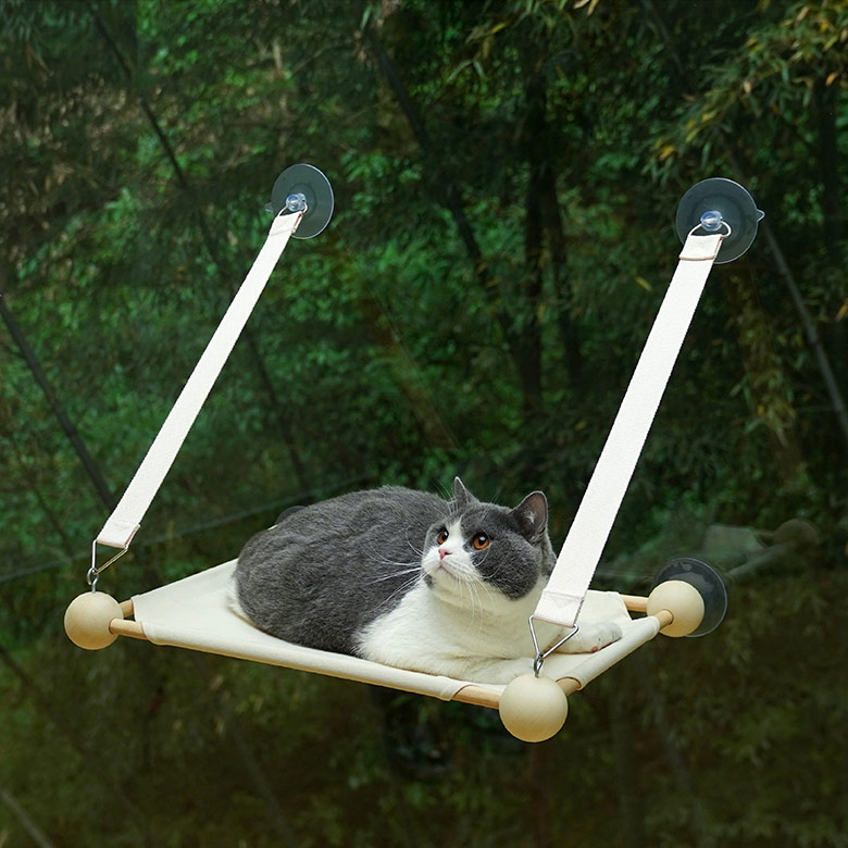 The cat hammock adopts a log-style design, the combination of locust wood and pure color twill fabric brings a rustic and comfortable atmosphere. The thickened suction cup that has passed the load-bearing test has strong adsorption force, and the widened canvas support belt with stainless steel hardware hooks can provide enough support, so that fat cats can also bask in the sun steadily and leisurely
